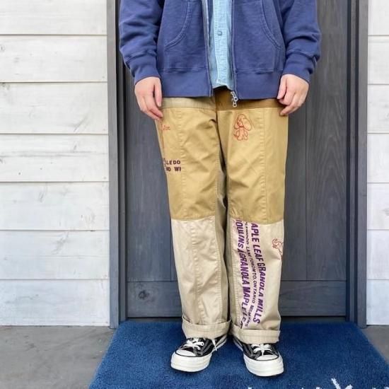 切り替えでパッチワークのデザインが目を引くチノ素材のパンツです。
